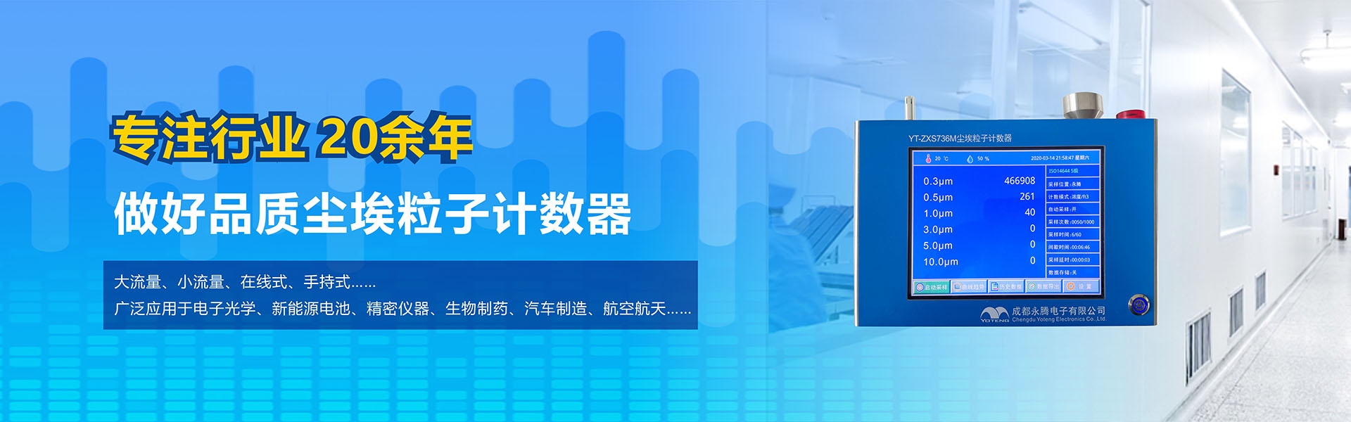 成都永騰電子有限公司位于成都市國家經(jīng)濟(jì)技術(shù)開發(fā)區(qū),是一家專業(yè)從事環(huán)境空氣監(jiān)測儀器研發(fā)、生產(chǎn)、銷售于一體的高科技企業(yè)。產(chǎn)品涵蓋空氣檢測儀器、潔凈間在線塵埃粒子計數(shù)器監(jiān)測系統(tǒng)、大氣顆粒物監(jiān)測微站系統(tǒng)、電化學(xué)分析儀器、實(shí)驗(yàn)室設(shè)備等產(chǎn)品。